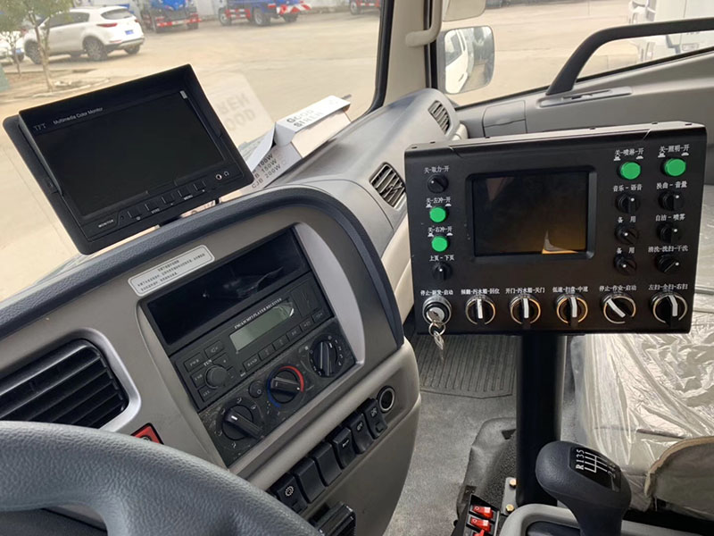 清扫装置型式:中置四盘扫+后置吸嘴,扫盘可自动避障;扫盘具有 3 种作业模式:全扫、左前不扫、右前不扫,实现路面的清扫及吸尘。该扫路车采用东风多利卡二类底盘改装,加装副发动机、风机、清水箱、垃圾箱、左右立扫、扫盘降尘系统,液压系统、专用装置电控系统和副车架等改装而成。